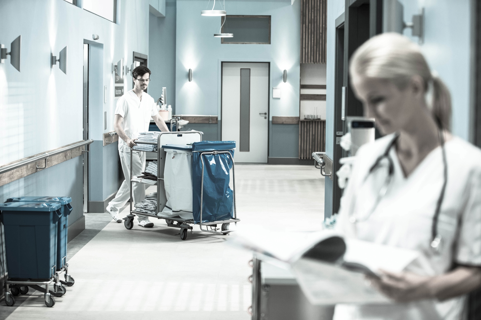 Onze Hammerlit producten: Linen logistics, Case carts medical logistics, Sterile goods logistics, OR equipment, Waste collection.
