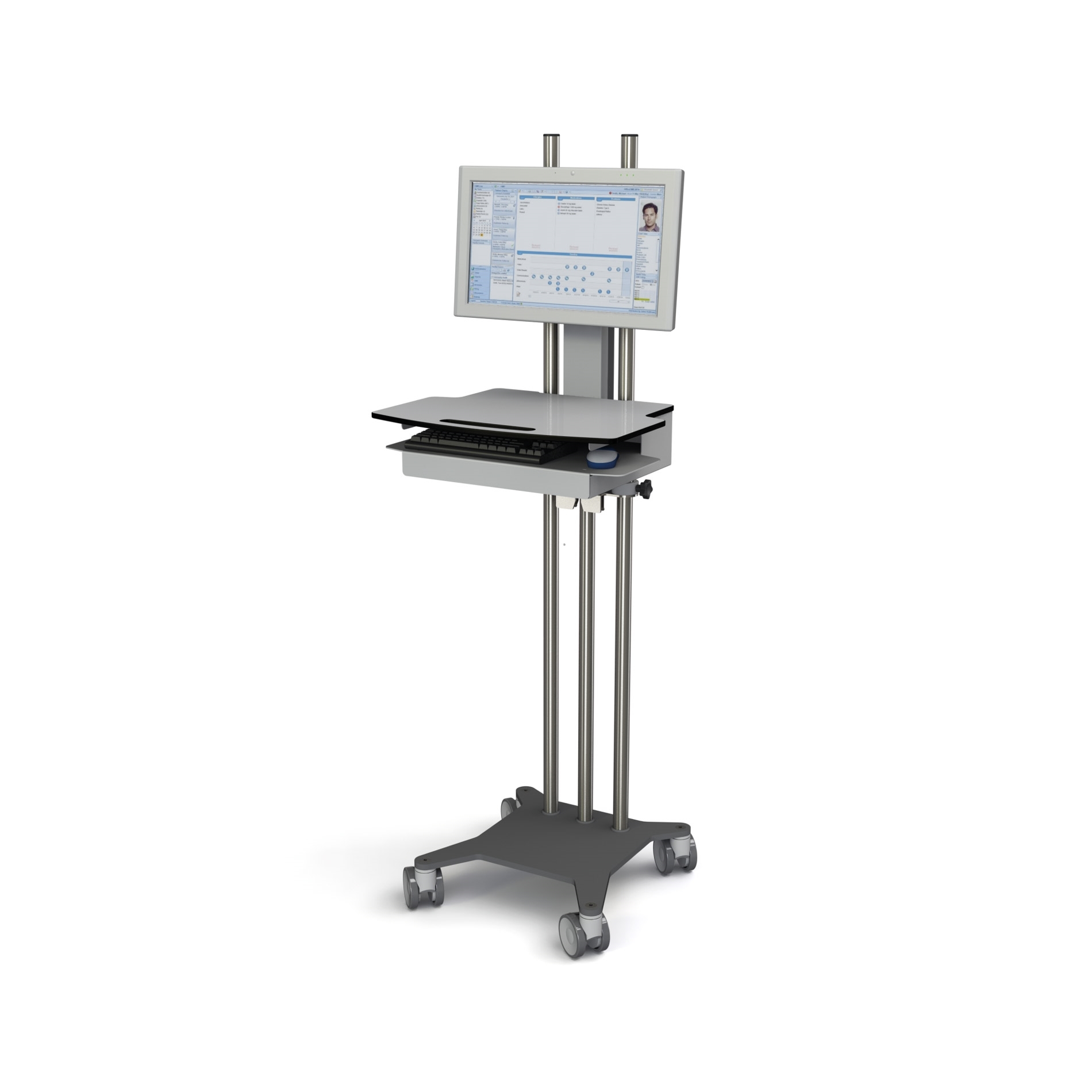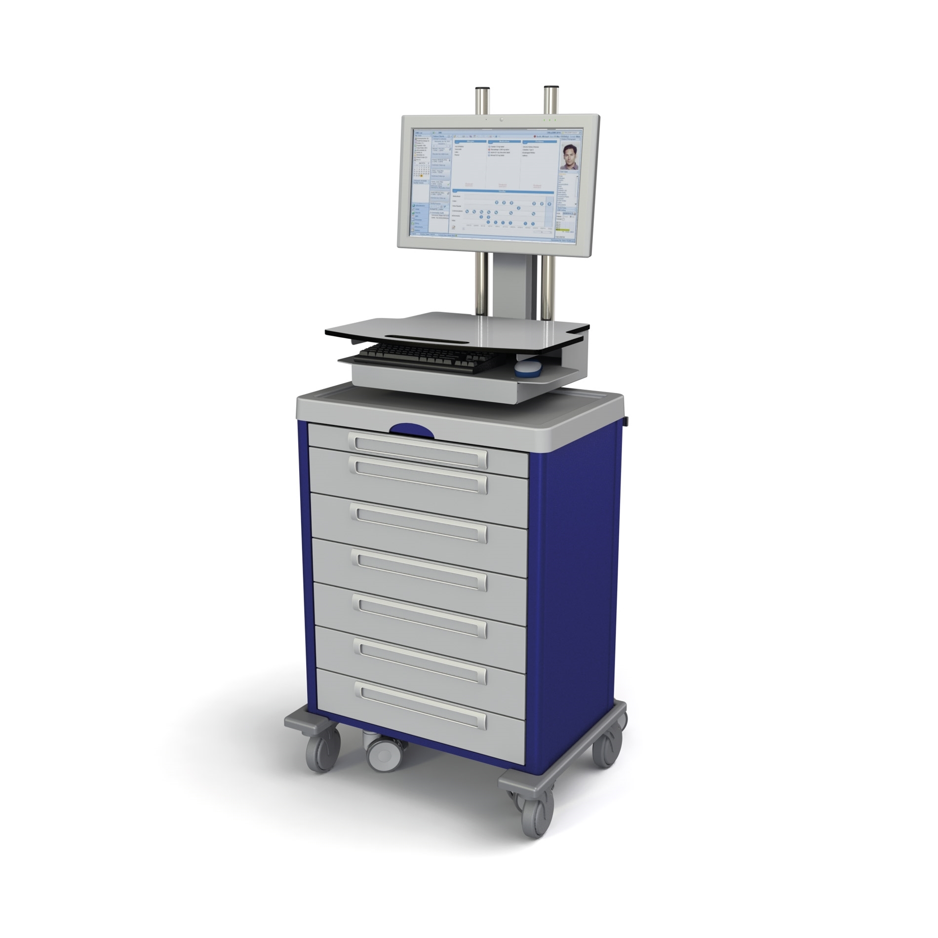 De All Modul koppelbare Computer On Wheels is uitstekend te combineren met de DT Research medische panel PC en een toetsenbord en muis. Voor de diverse accessoires zie onder andere onze ladewagen folder.