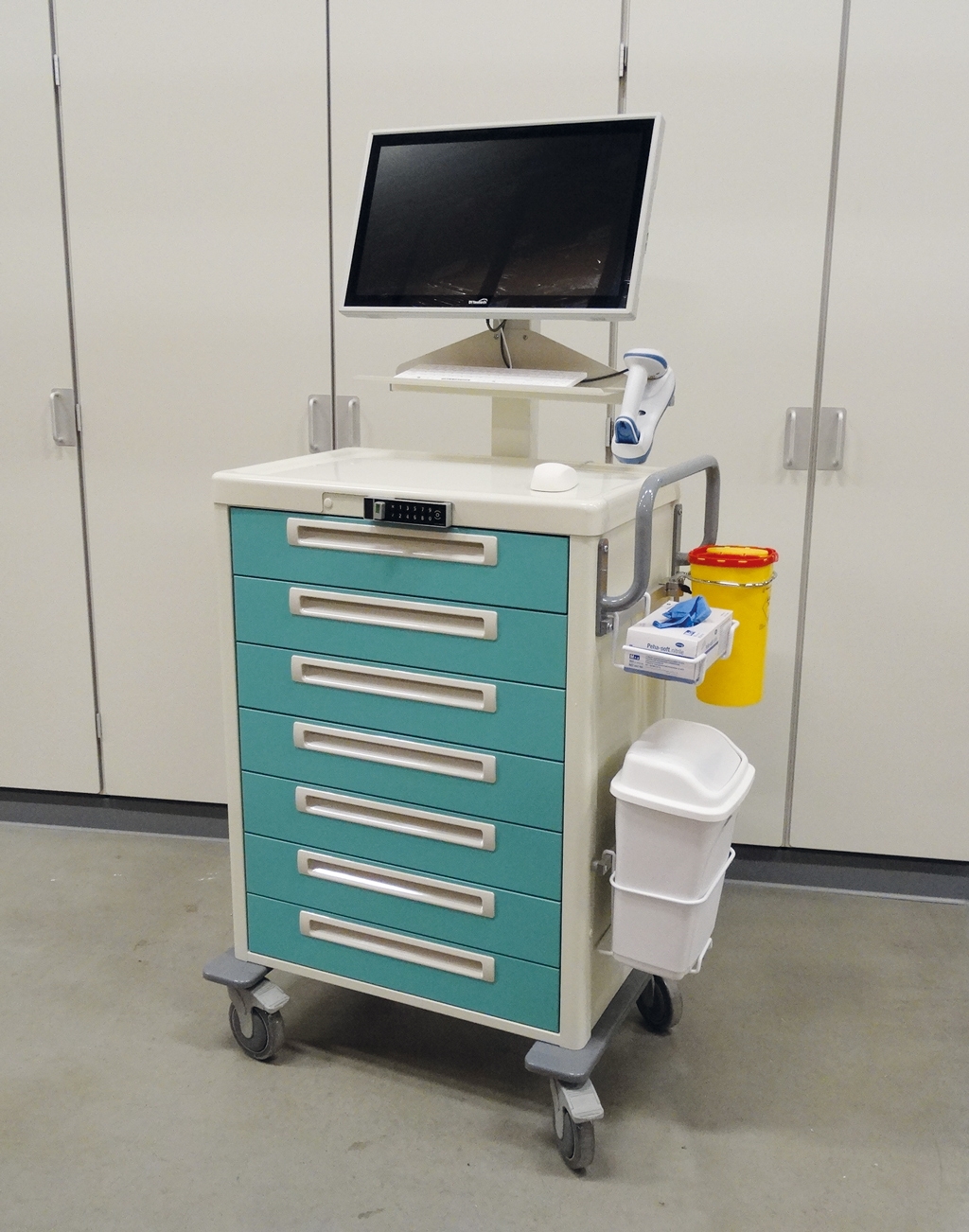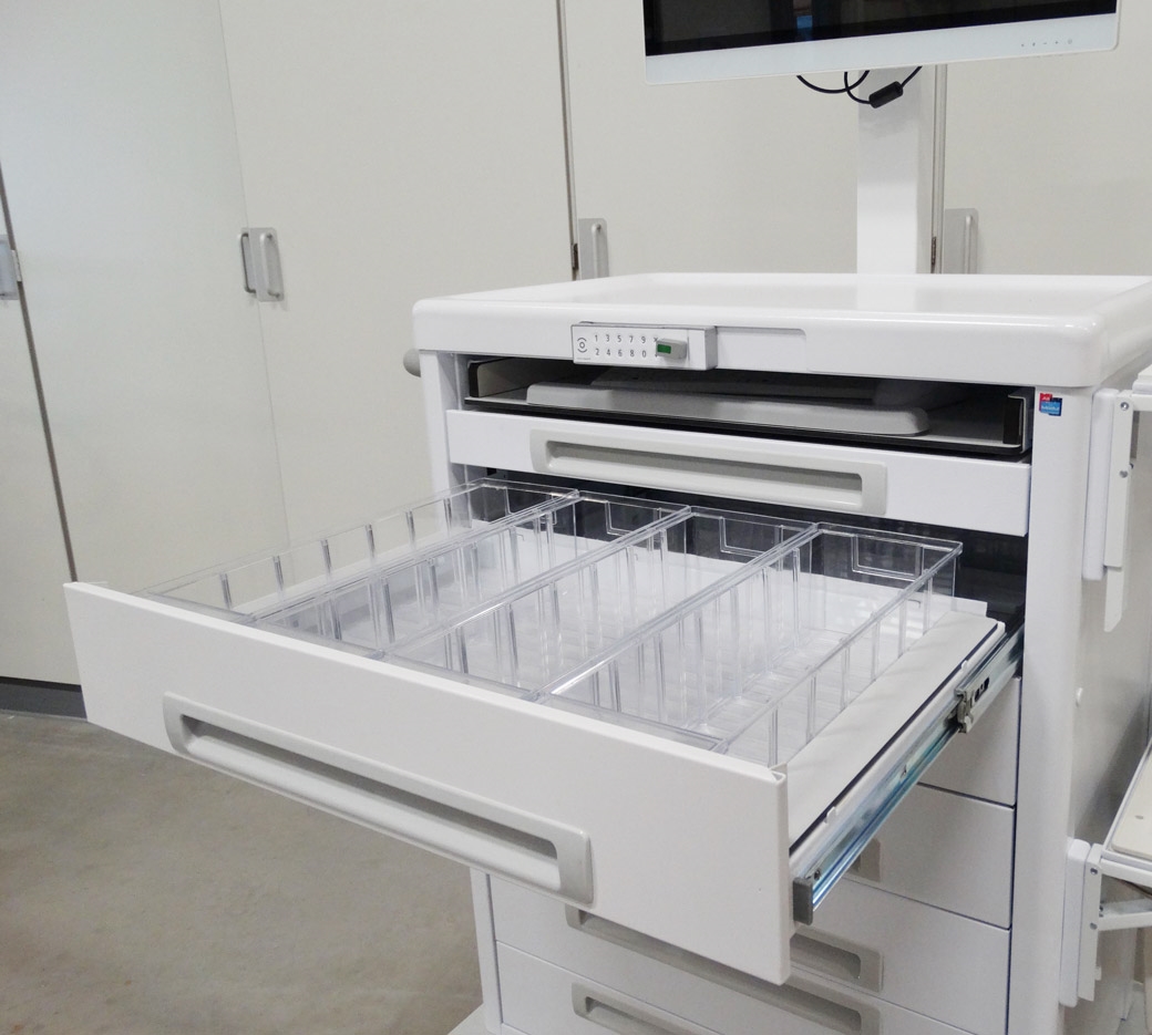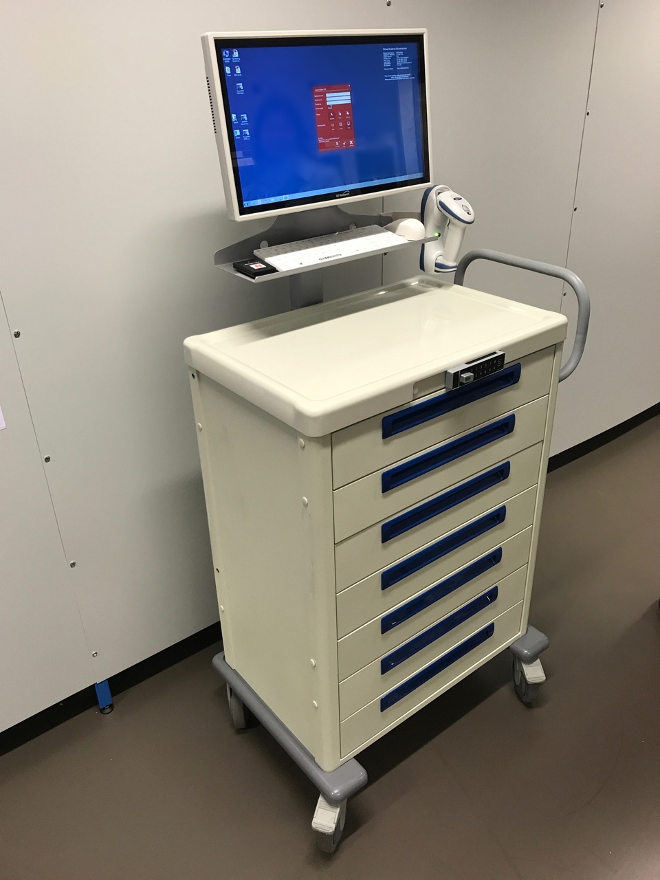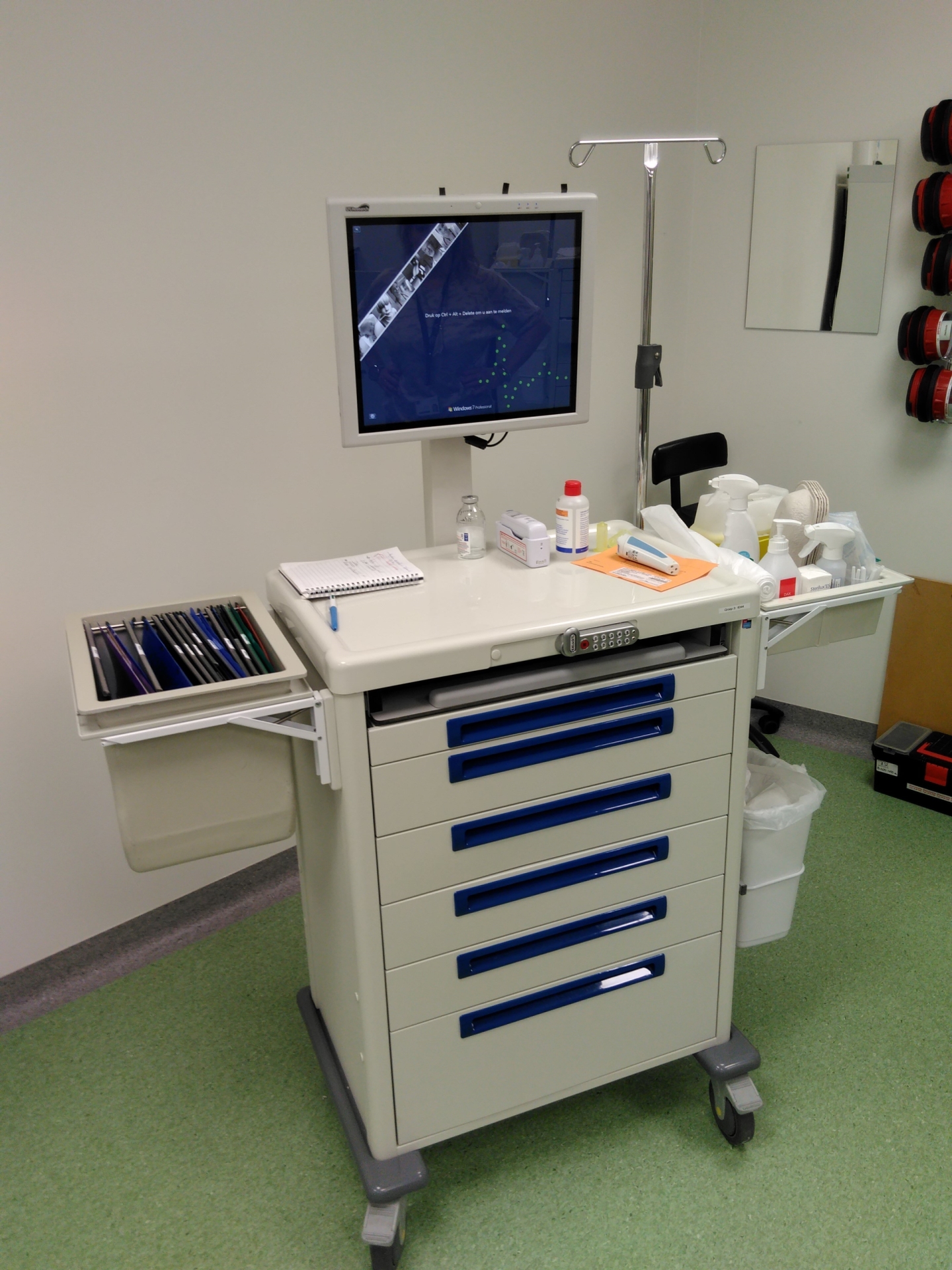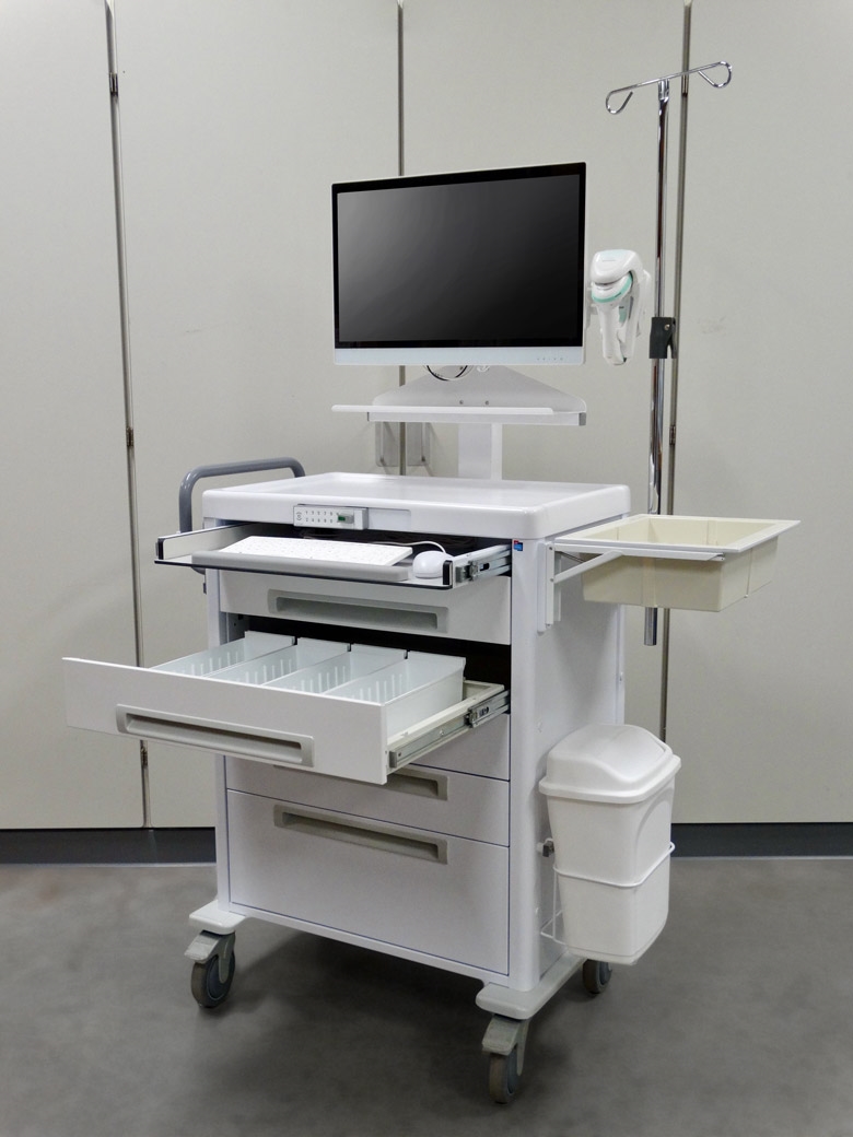 - De medicatiewagens zijn uitgerust met o.m. een 22" DTR medische PC, een IP68 medisch toetsenbord met IP68 muis en een Zebra barcodescanner. Tevens zijn er diverse accessoires uit ons assortiment gebruikt.