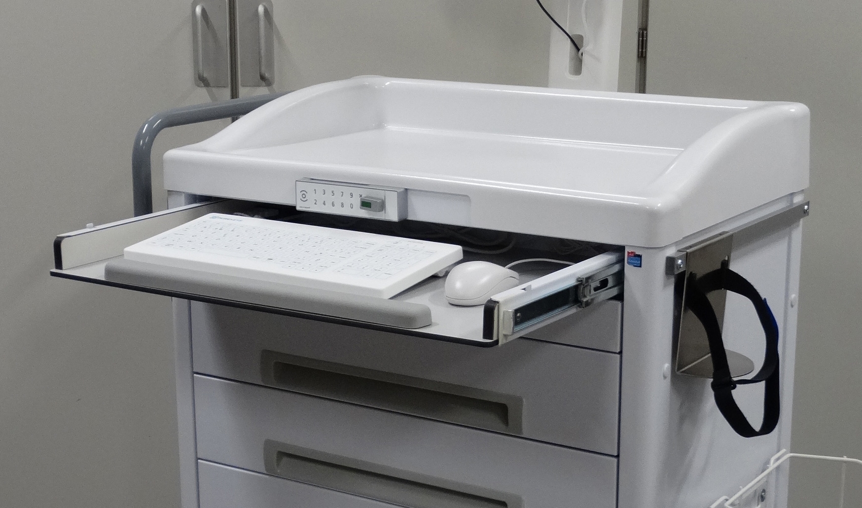 Onze modulaire medicatiewagen is uitstekend te combineren met de DT Research medische panel PC, elektronisch codeslot en een medisch toetsenbord en muis.