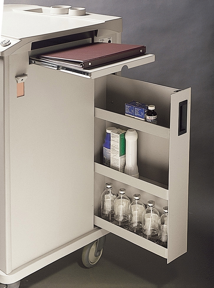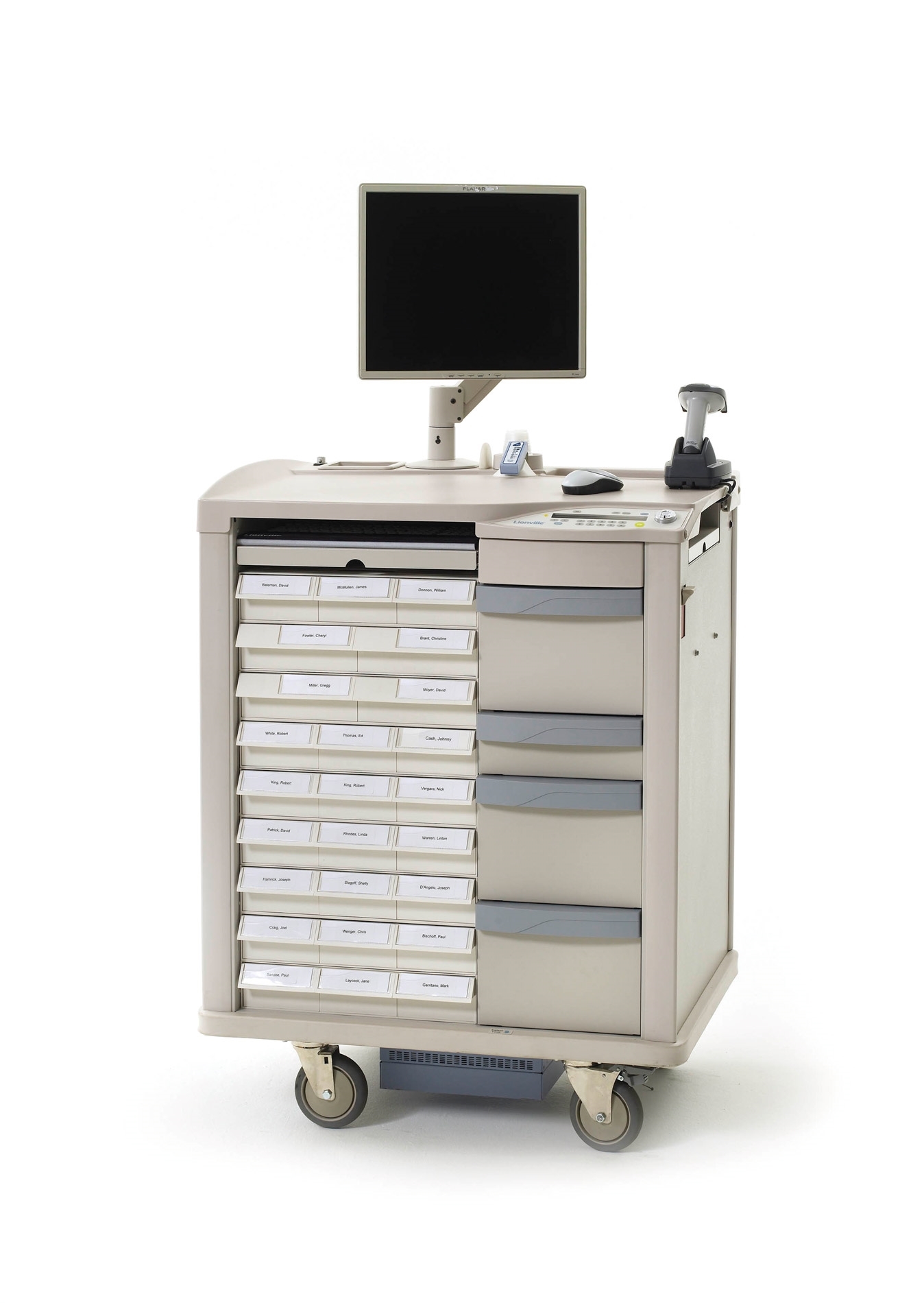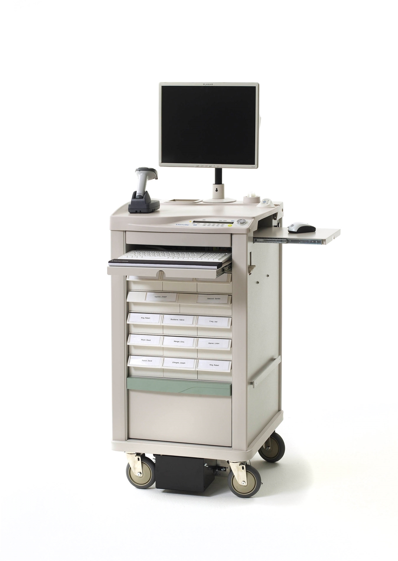 Deze niet-modulaire medicatiewagen is uitstekend te combineren met een Eizo beeldscherm, Mifare paslezer en barcodescanners.