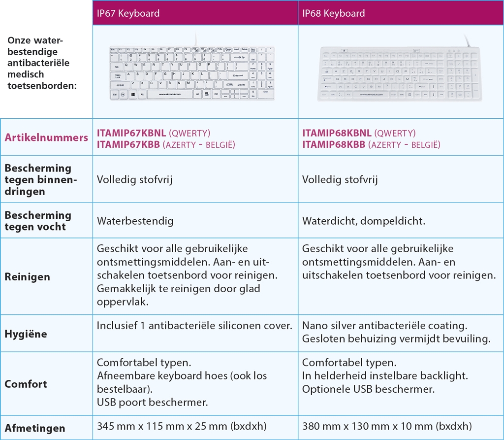 Onze hoogwaardige medische toetsenborden en muizen hebben een IP67 of IP68 code. IP code staat voor International Protection Rating. De cijfers lopen van 0 tot 8 waarbij het eerste cijfer gaat over bescherming tot binnendringen en het tweede cijfer gaat over bescherming tegen vocht. Nul betekent geen bescherming. U kunt een keuze maken uit twee optimaal hygiënische toetsenborden en muizen: IP67 of IP68. Beide toetsenborden en muizen zijn volledig stofdicht. Bij de bescherming tegen vocht heeft u bij ons de keuze tussen dompeldicht (IP67) en waterdicht (IP68). Dompeldicht wil zeggen geen indringing indien ondergedompeld (30 minuten op 1 meter). Waterdicht houdt in dat het apparaat bruikbaar blijft onder water onder omstandigheden gespecificeerd door fabrikant.