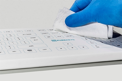 Medische toetsenborden van Purekeys zijn gemakkelijk en snel te desinfecteren. Ze zijn ontworpen voor gebruik in een omgeving waar gevaar dreigt voor besmetting via het toetsenbord. Alleen indien reinigen en desinfecteren in enkele seconden gedaan kan worden, zal dit in de praktijk ook regelmatig gebeuren. Daarom hebben Purekeys toetsenborden een volledig glad oppervlak zonder randen of naden waardoor het desinfecteren zeer snel en eenvoudig is. Met de dunne siliconen bescherming zijn de toetsenborden goed bestand tegen desinfectievloeistoffen terwijl de gebruiker kan typen als op een normaal toetsenbord.