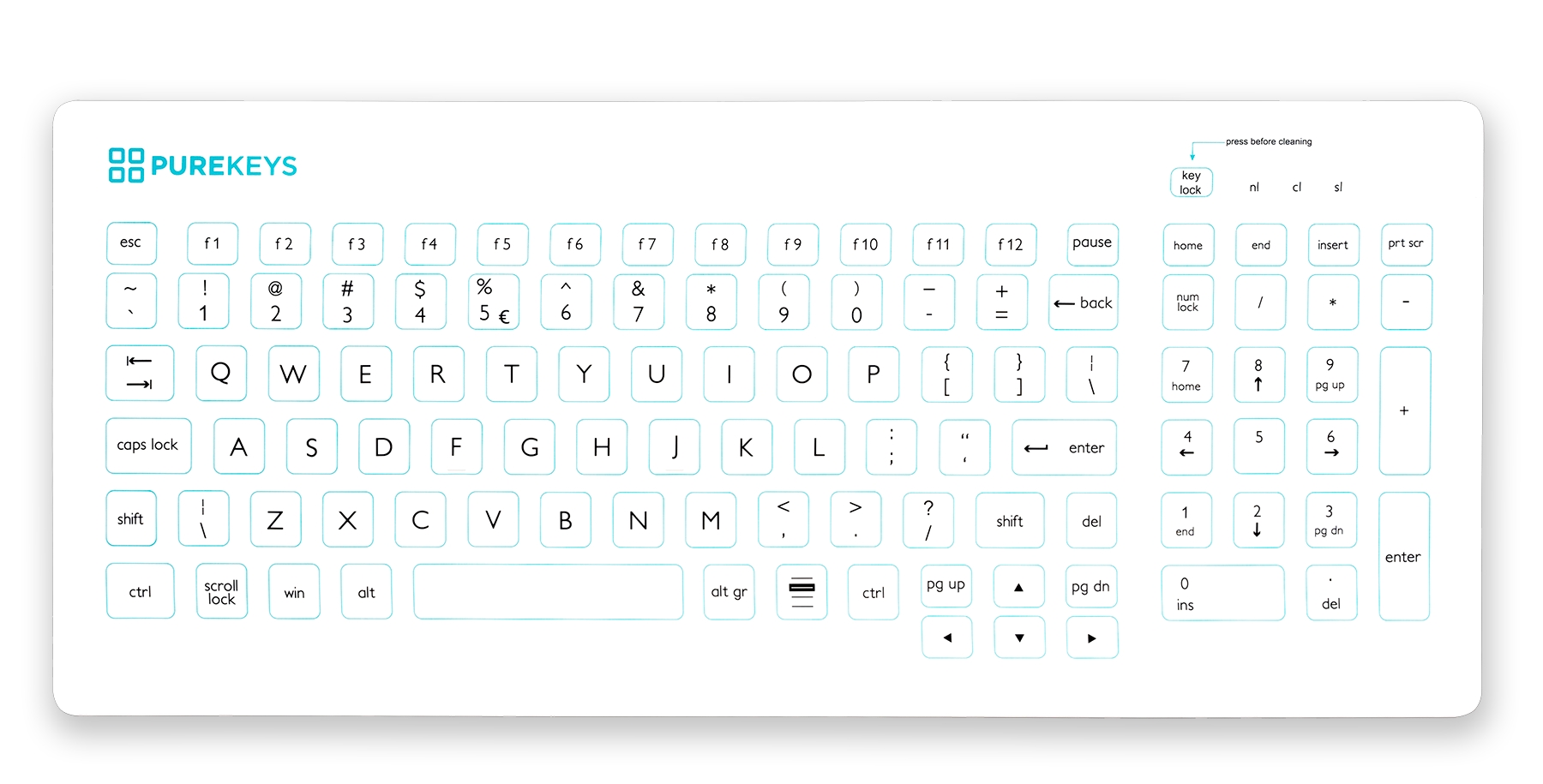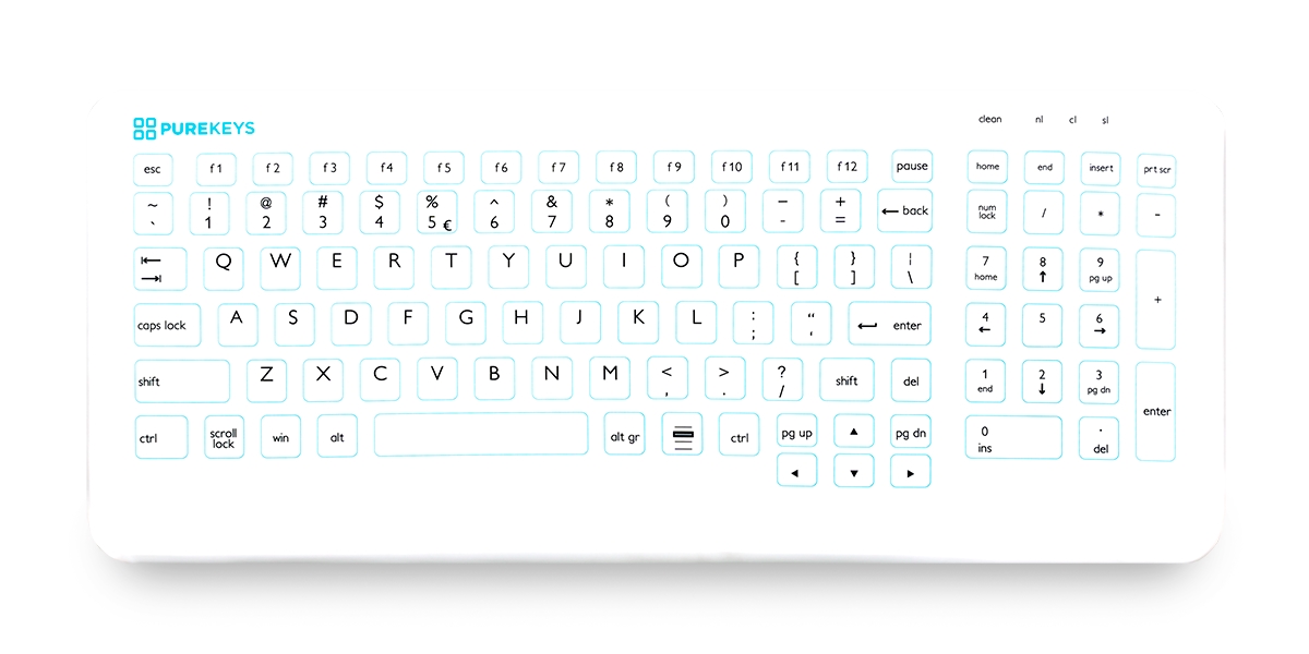 Met één druk op de aparte ‘key lock’ kunnen de toetsen uitgeschakeld worden tijdens het reinigen en desinfecteren. Purekeys medische toetsenborden zijn bestand tegen alle bekende desinfectiemiddelen zoals alcohol, peroxides, chlooroplossingen etc. Het gebruikte witte siliconen is van een zeer hoogwaardige kwaliteit. De bedrukking is overzichtelijk en duidelijk.