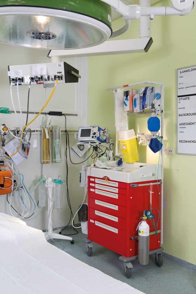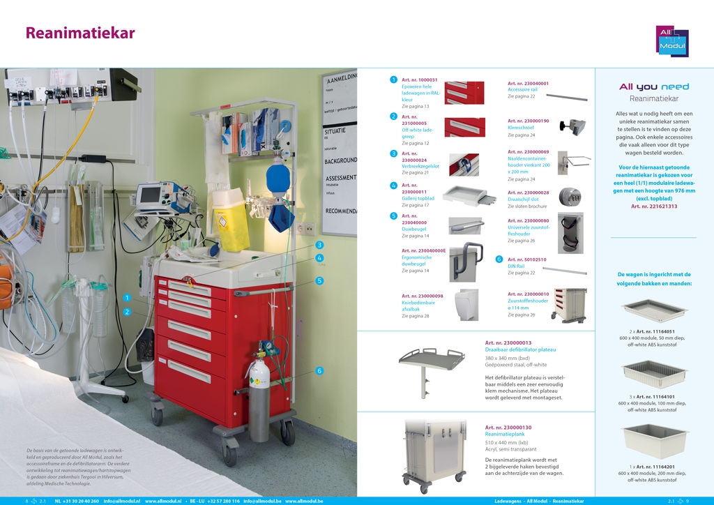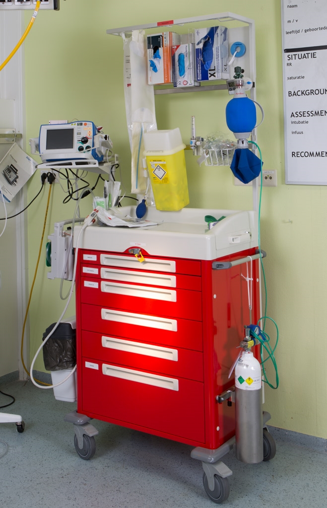 Om adequaat te kunnen inspringen op acute situaties kan een spoedkar uitkomst bieden. Onze stalen laden trolley is de basis om een reanimatiekar samen te stellen. Voor de hiernaast getoonde reanimatiewagen is gekozen voor een heel (1/1) modulaire ladewagen met een hoogte van 976 mm (excl. topblad). De body en ladefronten van de wagen hebben we geëpoxeerd in het rood dat binnen de zorg vaak als spoedeisende kleursignalering wordt gebruikt. Wij kunnen, indien wenselijk, uw crashkar ook voorzien van belettering als signalering. De basis van de hiernaast getoonde ladewagen inclusief het accessoire frame en de defibrilatorarm is ontwikkeld en geproduceerd door All Modul. De verdere ontwikkeling tot reanimatiewagen/hartstopwagen is gedaan door ziekenhuis Tergooi in Hilversum, afdeling medische technologie. Er zijn verschillende ladewagen hoogtes beschikbaar. Bij de verschillende ladewagen hoogtes zijn diverse ladeconfiguraties mogelijk. U bepaalt zelf de indeling. Deze is altijd eenvoudig en snel zelf aan te passen.