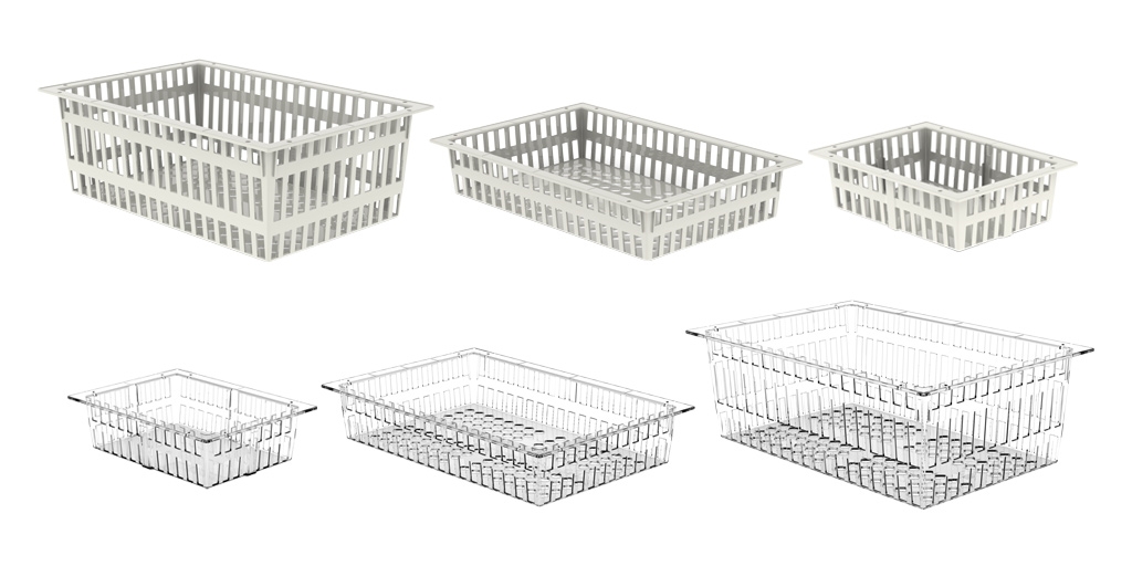 Bij modules maken we onderscheid tussen kunststof-, draad- en RVS-manden. Wat betreft de maatvoering zijn hele en halve modules mogelijk van 600x400mm en 300x400mm. De manden kennen vijf verschillende hoogtematen: 15, 50, 100, 150 en 200mm.