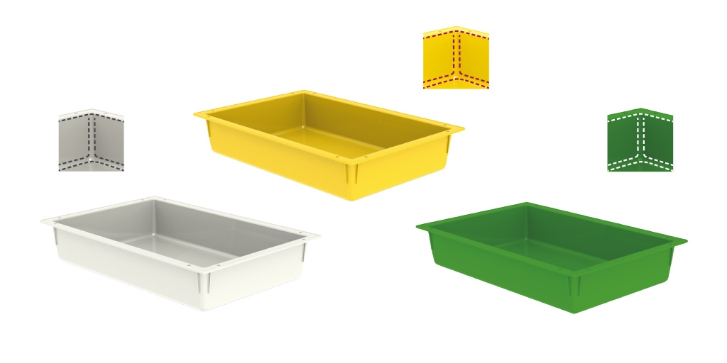 De gele en groene modules zijn gemaakt van door ons aangepast polypropeen kunststof. Wij noemen dit PP+. De gele PP+ modules zijn in verschillende formaten beschikbaar. De groene module is vooralsnog enkel beschikbaar in de afmetingen 600x400x100 niet sepereerbaar met een bijpassende deksel 600x400x15 niet sepereerbaar. Twee PP+ bakken zijn revolutionair met afgeronde hoeken waar geen vocht in kan ophopen na een reinigsproces. Dat zijn 600x400 mm modules in het groen en geel. Deze zijn ideaal voor flexibele scopenopslag en –transport. De groene PP+ modules zijn niet alleen thermisch desinfecteerbaar, maar ook anti-bacterieel.