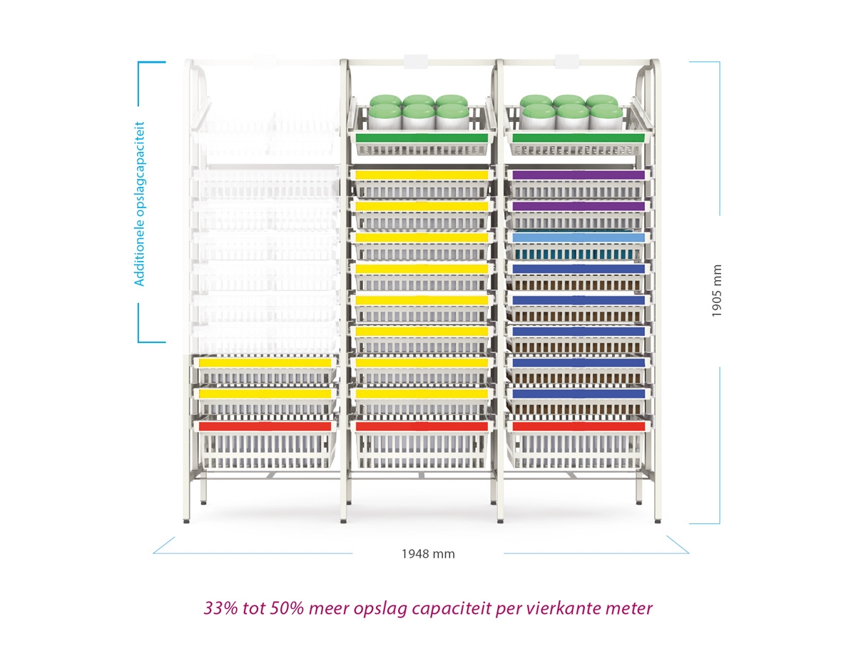 De modules en manden in de modulaire rekken kunnen diagonaal of horizontaal worden opgeborgen en worden gekanteld bij gebruik. Dit is ergonomisch prettig werken voor de gebruiker.